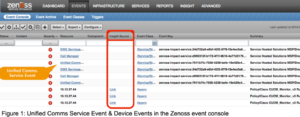 In Figure 1, service events appear for the Unified Communications service in the Zenoss event console. Events for the UC resource 10.13.37.44 also appear with a new, augmented field “Insight Source” that contains URL callback links to the original UC alert details.