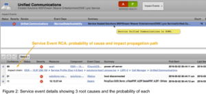 The operator clicks on the indicated Unified Communications service event to see the root cause details in Figure 2. The highest root cause probability is expanded to show how an event affecting ESXi infrastructure was propagated through the model until it resulted in generation of the Unified Communications Service Event.